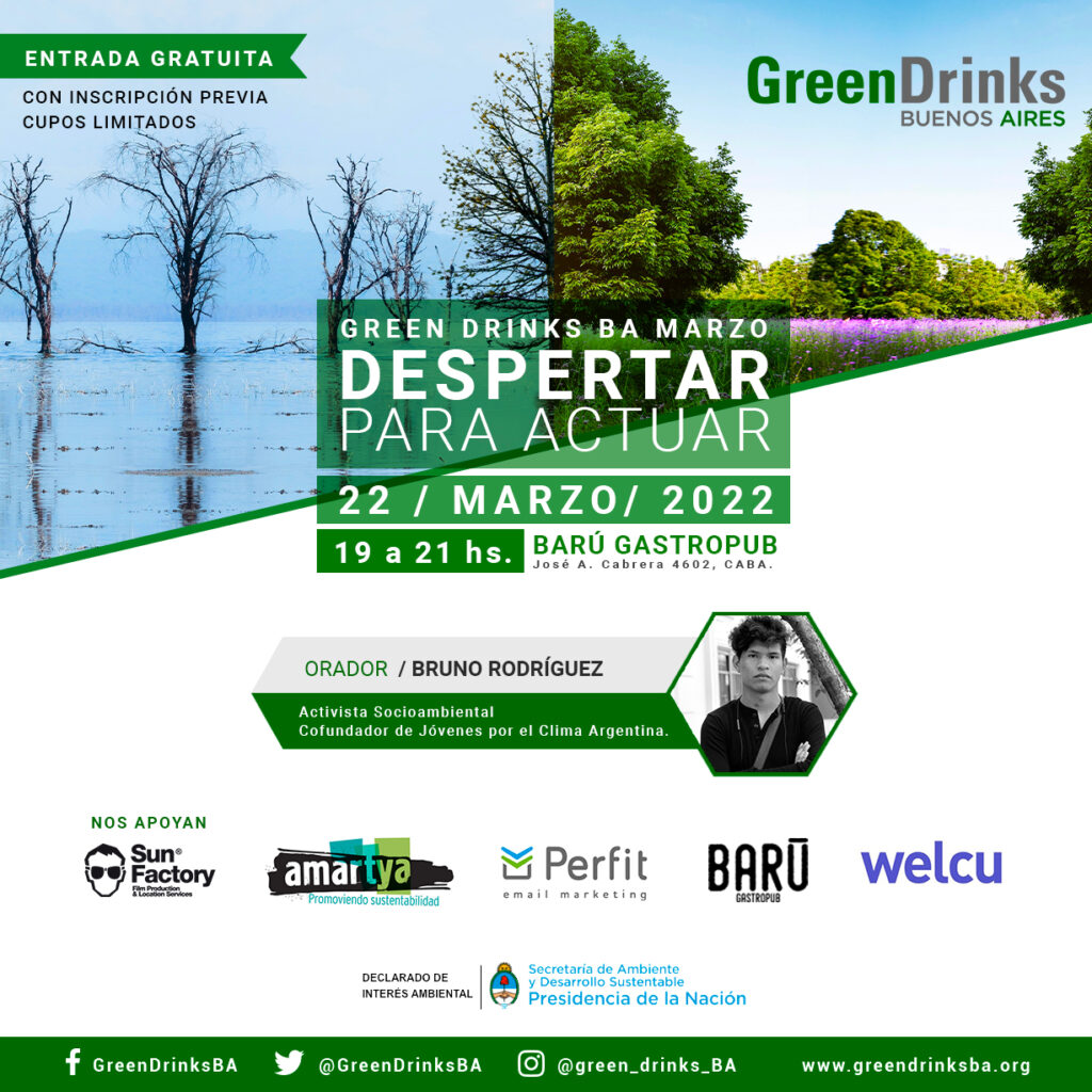 Los invitamos al Green Drinks BA Marzo | Despertar para actuar, el Martes 22 de Marzo a las 19 hs. en Barú Gastropub, Cabrera 4602, CABA, en el que nos visitará Bruno Rodríguez, Activista socioambiental, Cofundador de Jóvenes por el Clima Argentina, movimiento ambientalista contra la crisis climática nacido del movimiento Fridays for Future, creado […]